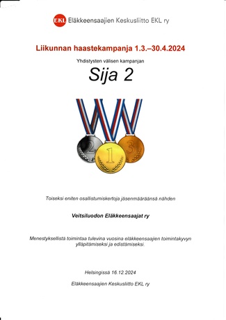 Kiitos liikkujille! Tämä olikin yllätys. Saimme kunniamaininnan liikkumiseta v.2024. Jatketaan samaan malliin tänäkin vuonna. Muistetaan merkintä joka päivälle maaliskuussa ja huhtikuussa. Erityiskiitos kaikille, jotka teitte tämän mahdolliseksi. |